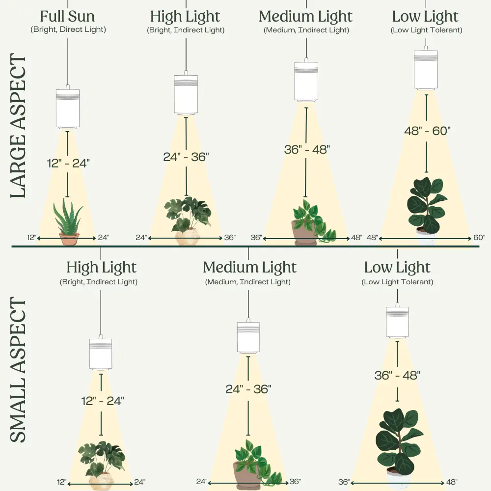 Finding the right distance between the Aspect grow light and your plant can be a challenge. The hanging height may vary if your plant receives significant natural light or no light at all. Below are the hanging heights and corresponding coverage area for both the small and large Aspect grow lights. This page includes recommended hanging heights and a link to our plant guide. Make sure to pay attention to your plants. Adjust the hanging height if you notice your plant stretching or the leaves burning.